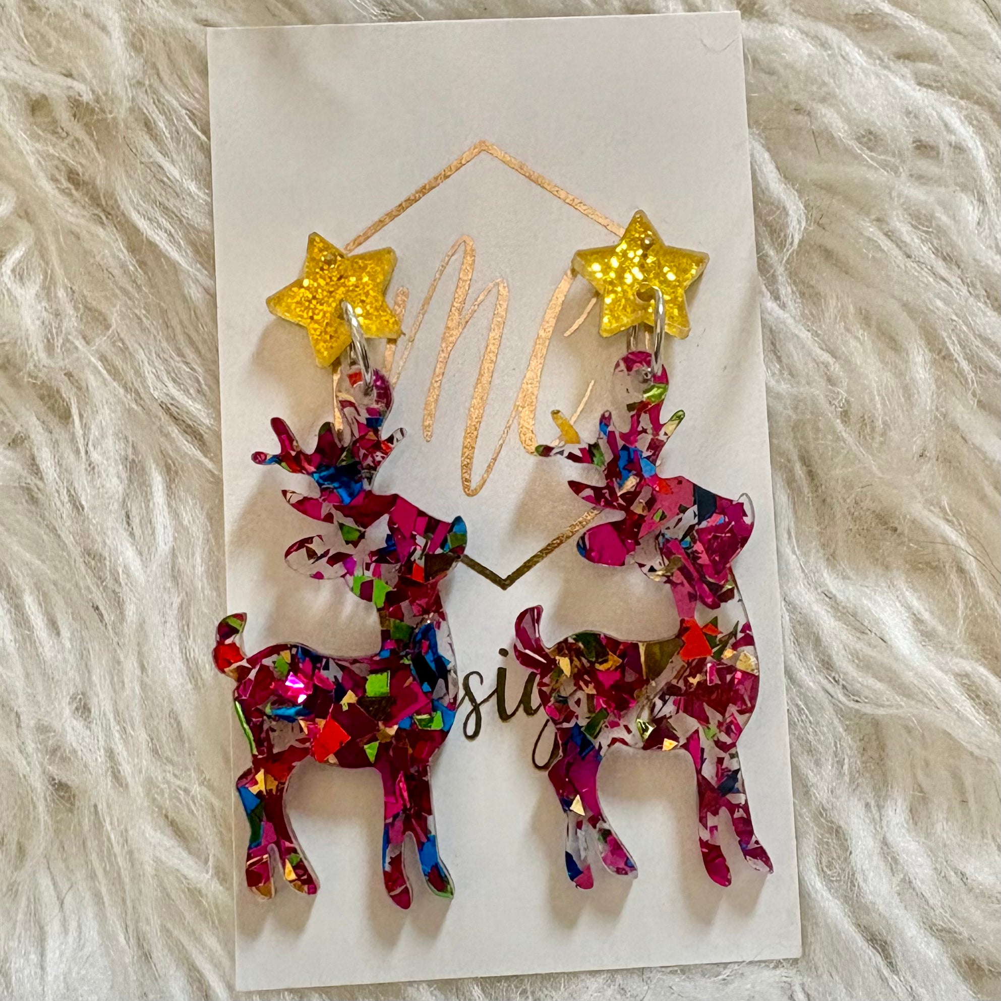 Colorful Glitter Confetti Christmas Tree and Reindeer Earrings