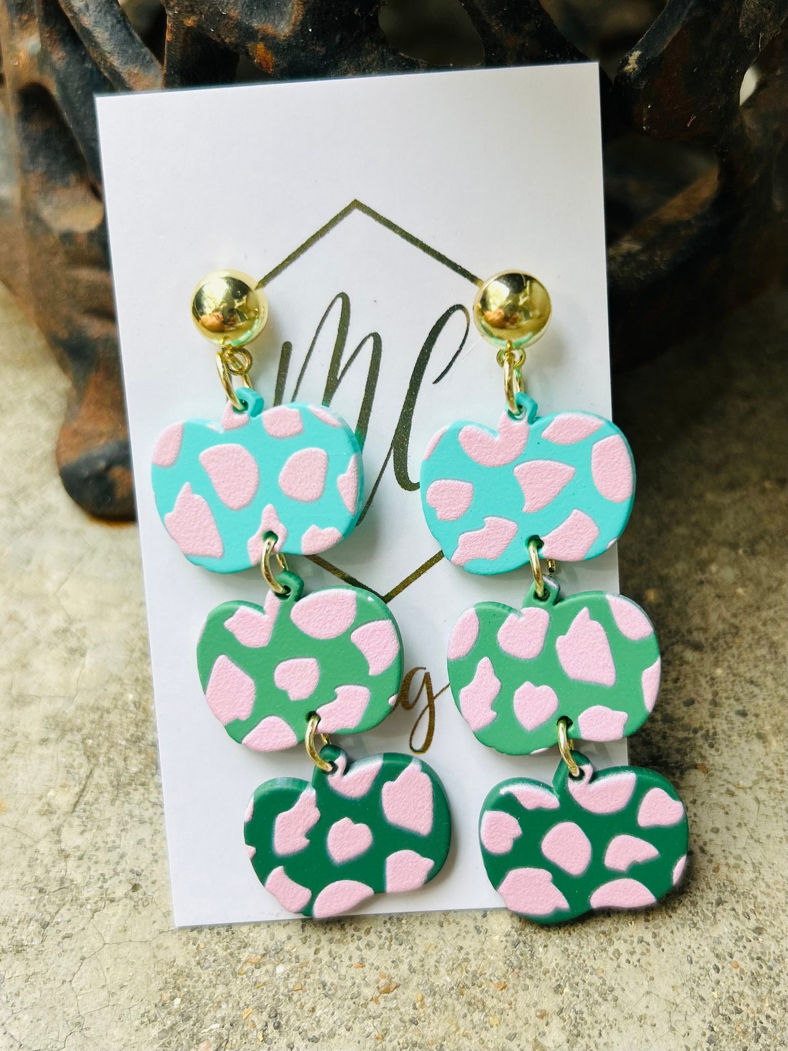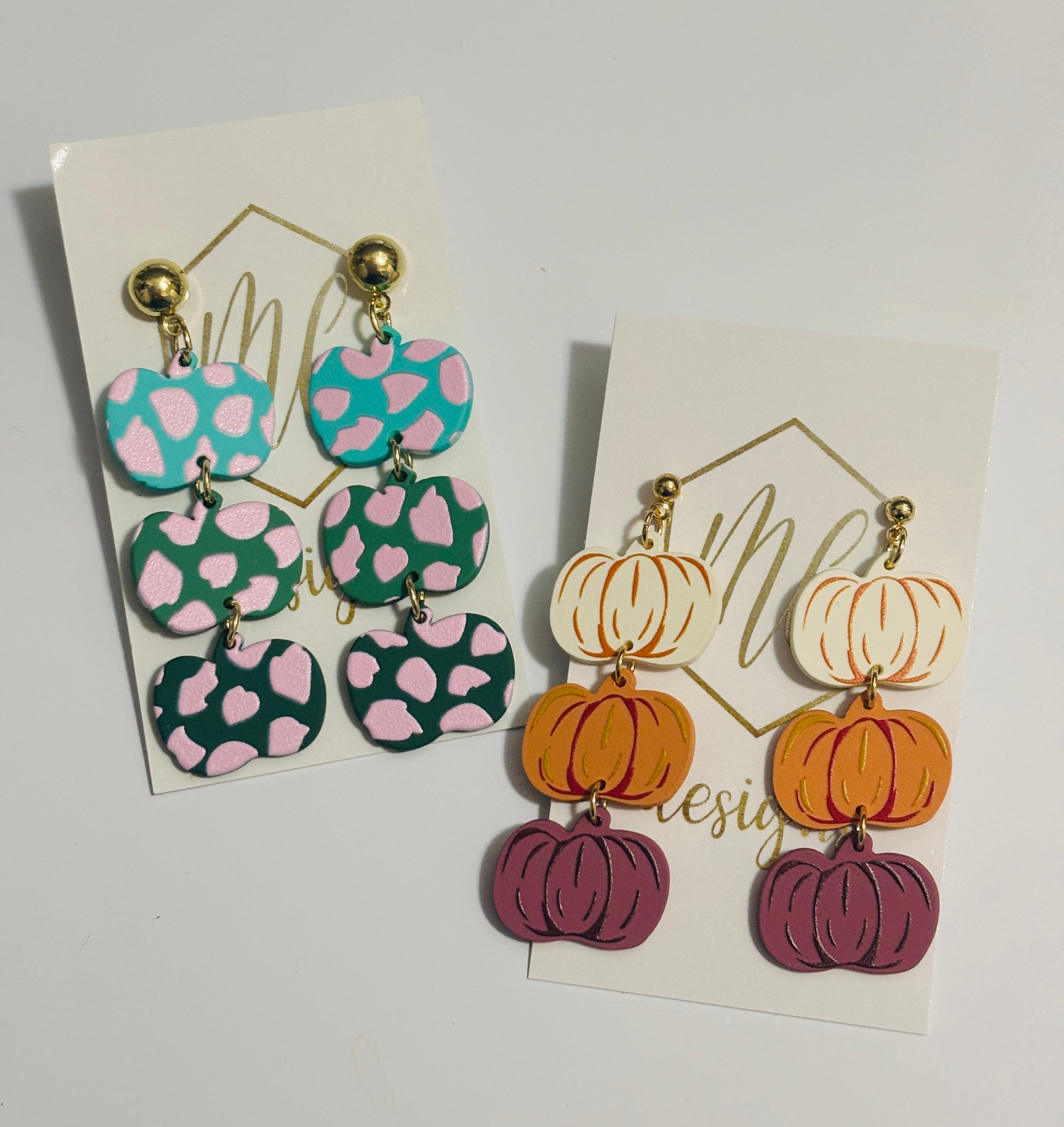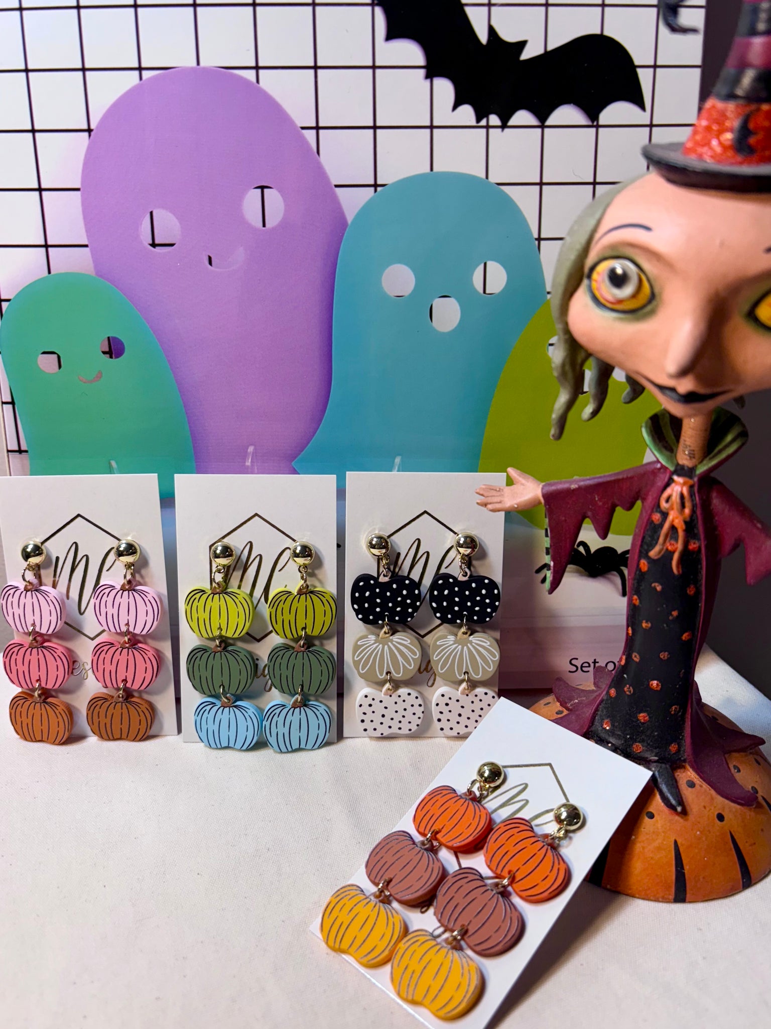 Hand-painted triple acrylic pumpkins featuring silk-screened designs in seasonal Halloween and autumnal hues.