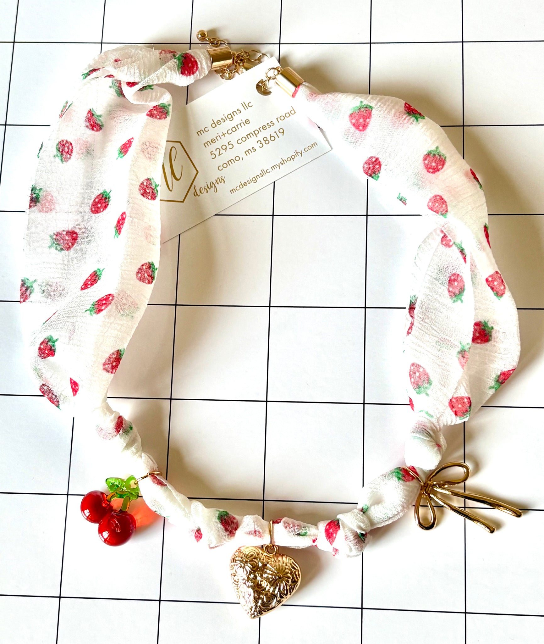 Bohemian Scarf Charm Necklace, featuring a soft, knotted scarf adorned with strawberry charms with cherry hear bow strawberry, this accessory brings a playful yet elegant coastal touch to any outfit. Perfect for layering over summer dresses or adding flair to everyday looks Product Details: length: 16" - 18" varies ext: 3" Ball Chain Ext clasp: Lobster Claw metal finish: Gold Plated product: Lead & Nickel Compliant durability: Double E-coating