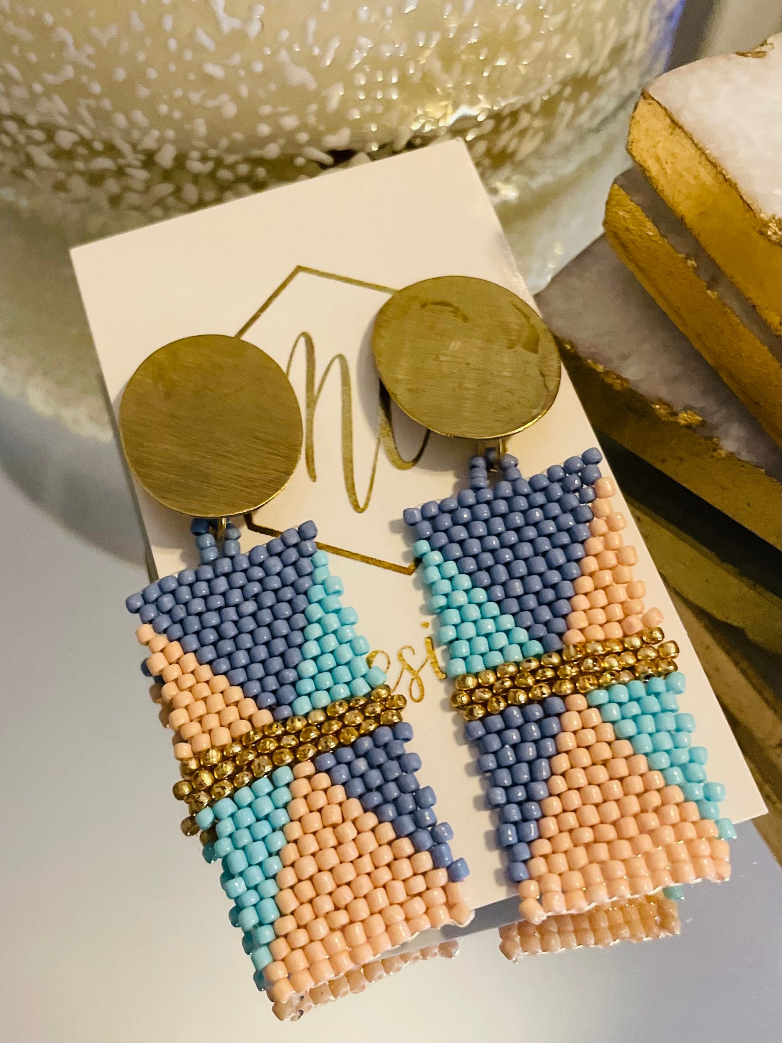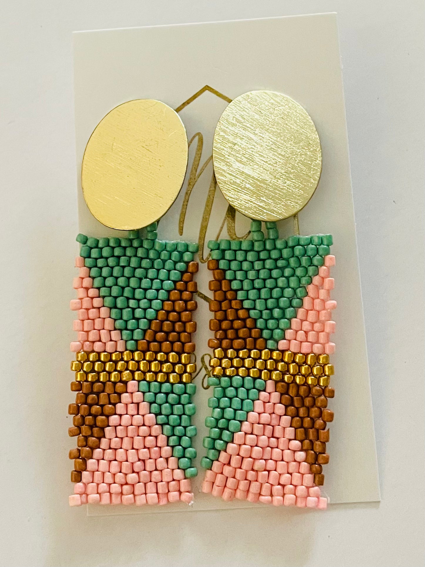 Beaded Rectangle Earrings with Gold Oval Top