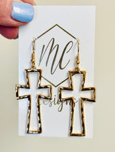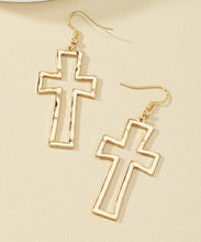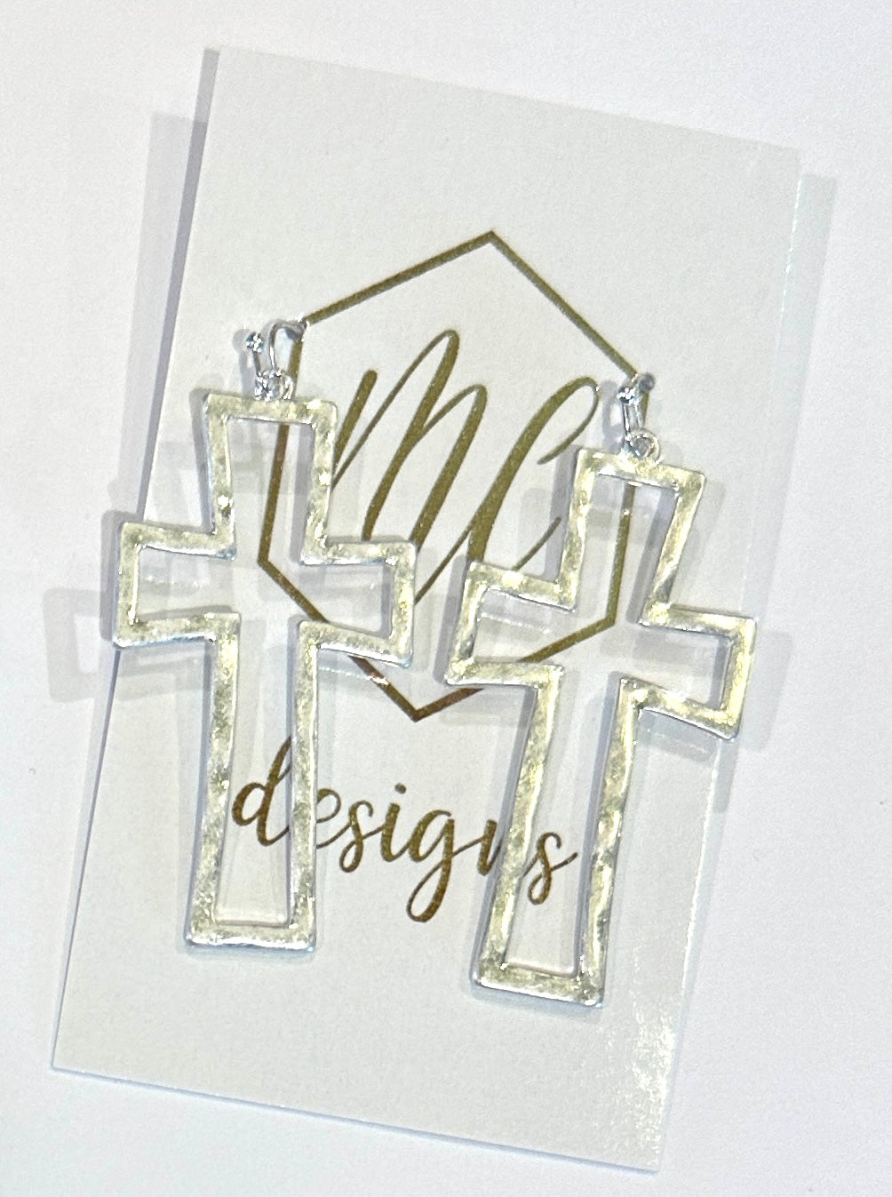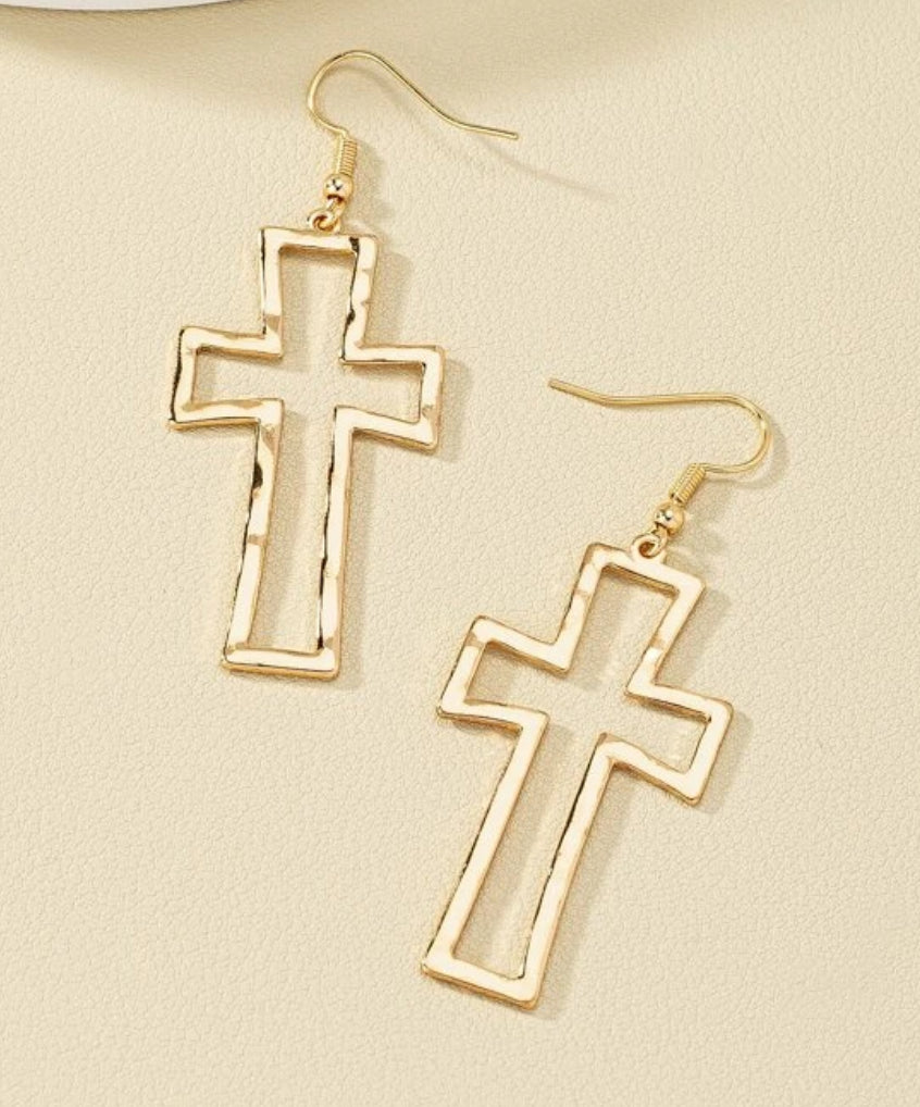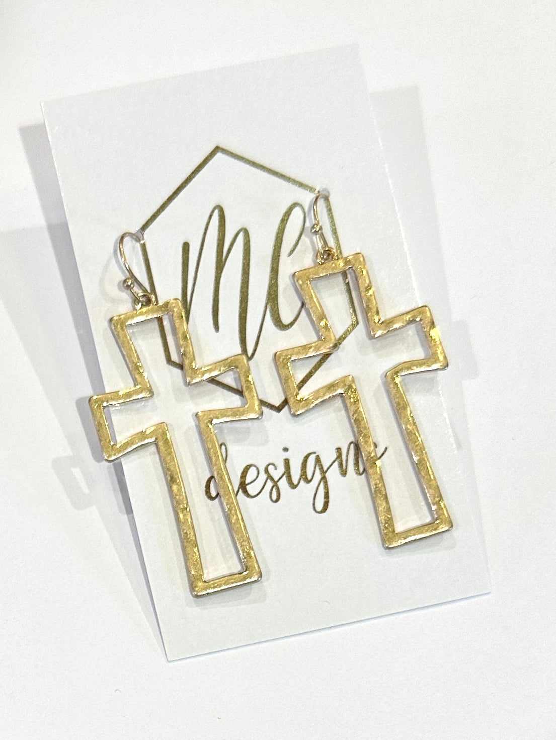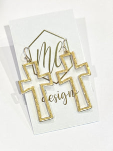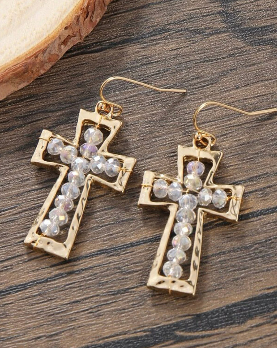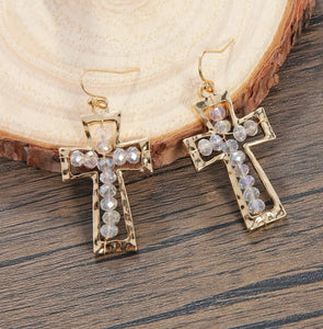 Cross Dangle Earrings - Open Worn Gold and Silver Hammered, Shinny Gold Hammered, Shinny Gold with Clear Beads