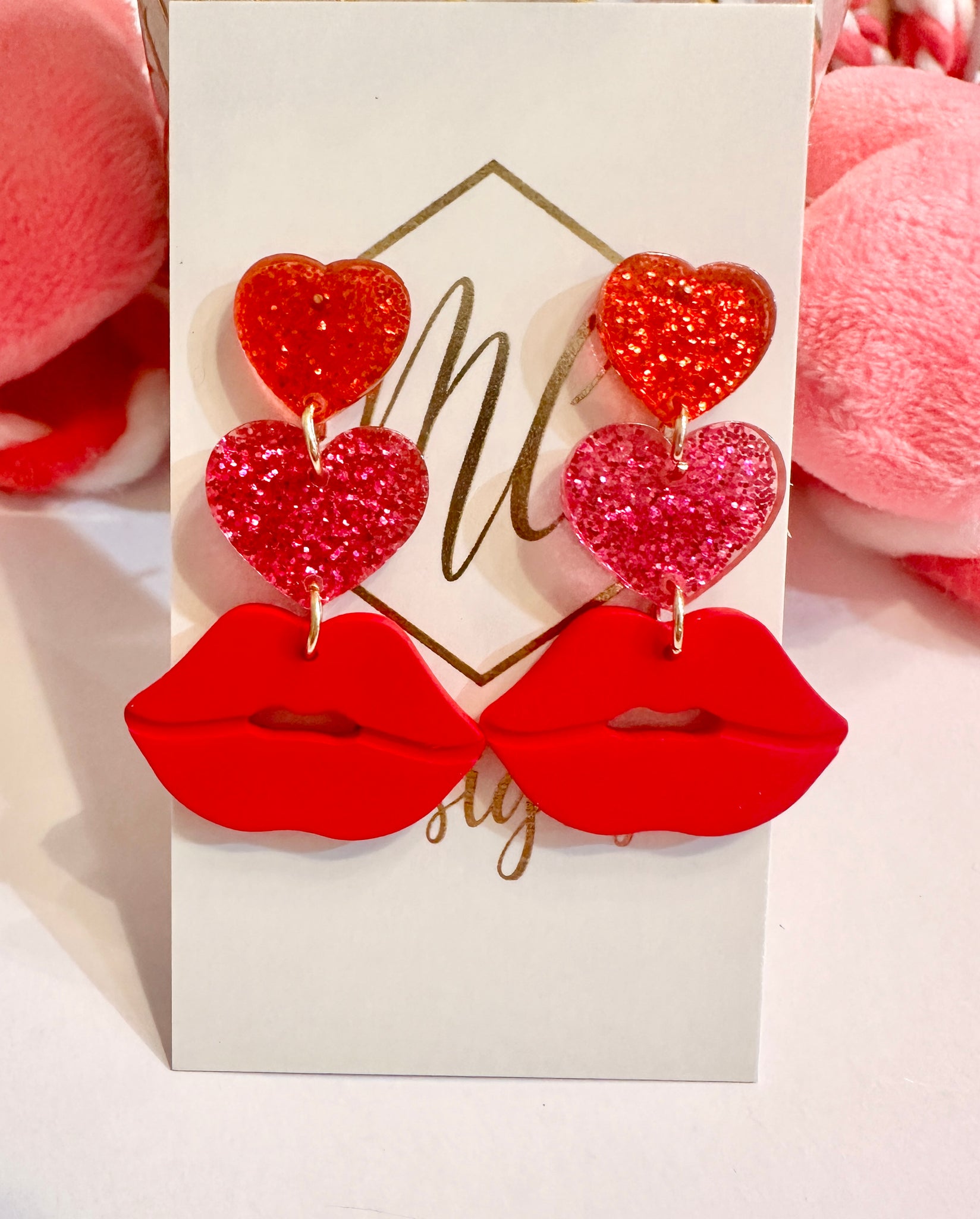 Handmade Glitter Acrylic Heart and Clay Lips -Great Valentine’s Day Earrings